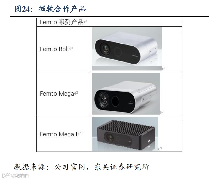 23 年微软成为公司新的合作伙伴,奥比中光与微软共同开发的 Femto 系列 iToF 相机,继承了微软 AzureKinect 的技术优势,具备高性能和高精度的特点,该 3D 视觉传感器已广泛应用于机器人、3D 扫描、生物识别等多个领域,并在全球范围内获得了超过1000 家客户的认可。