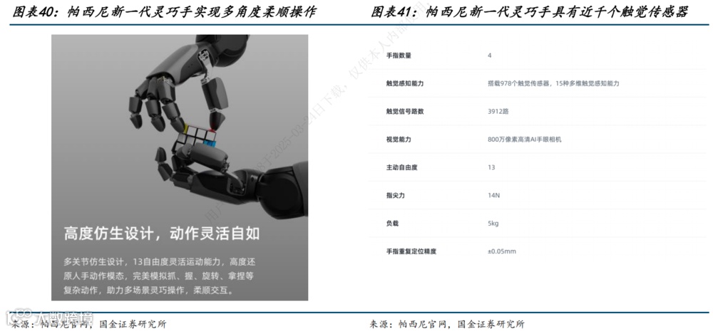 国内触觉领域头部厂商帕西尼的新一代灵巧手 DexH13 能够实现抓、握、旋转、拿捏等多个复杂动作,实现柔顺交互。此外,从传感器的数量和灵敏度来看,帕西尼新一代灵巧手具有 978 个触觉传感器,对于手指重复定位精度达到±0.05mm;助力实现更高精度的操作。