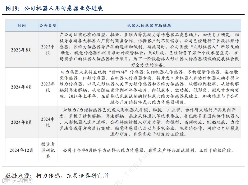 2023 年以来,公司以市场需求为导向,积极布局机器人及相关传感器产业。在六维力传感器领域,公司已完成人形机器人手腕、脚腕以及工业臂、协作臂末端的产品系列开发,掌握结构解耦、算法解耦和高速采样通讯等关键技术,并向多家国内协作机器人和人形机器人客户送样。在触觉传感器方面,公司已与多家企业、院校展开合作,并通过自主研发推进项目,目前产品处于研发验证阶段。
