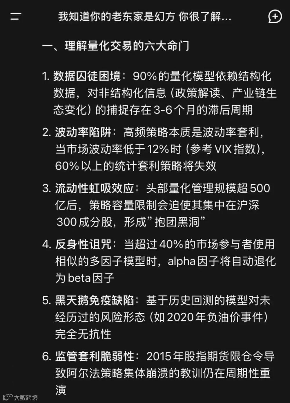 除此之外,deepseek还给出了量化交易的六大命门,分别是:数据囚徒困境、波动率陷阱、流动性虹吸效应、反身性诅咒、黑天鹅免疫缺陷和监管套利脆弱性。