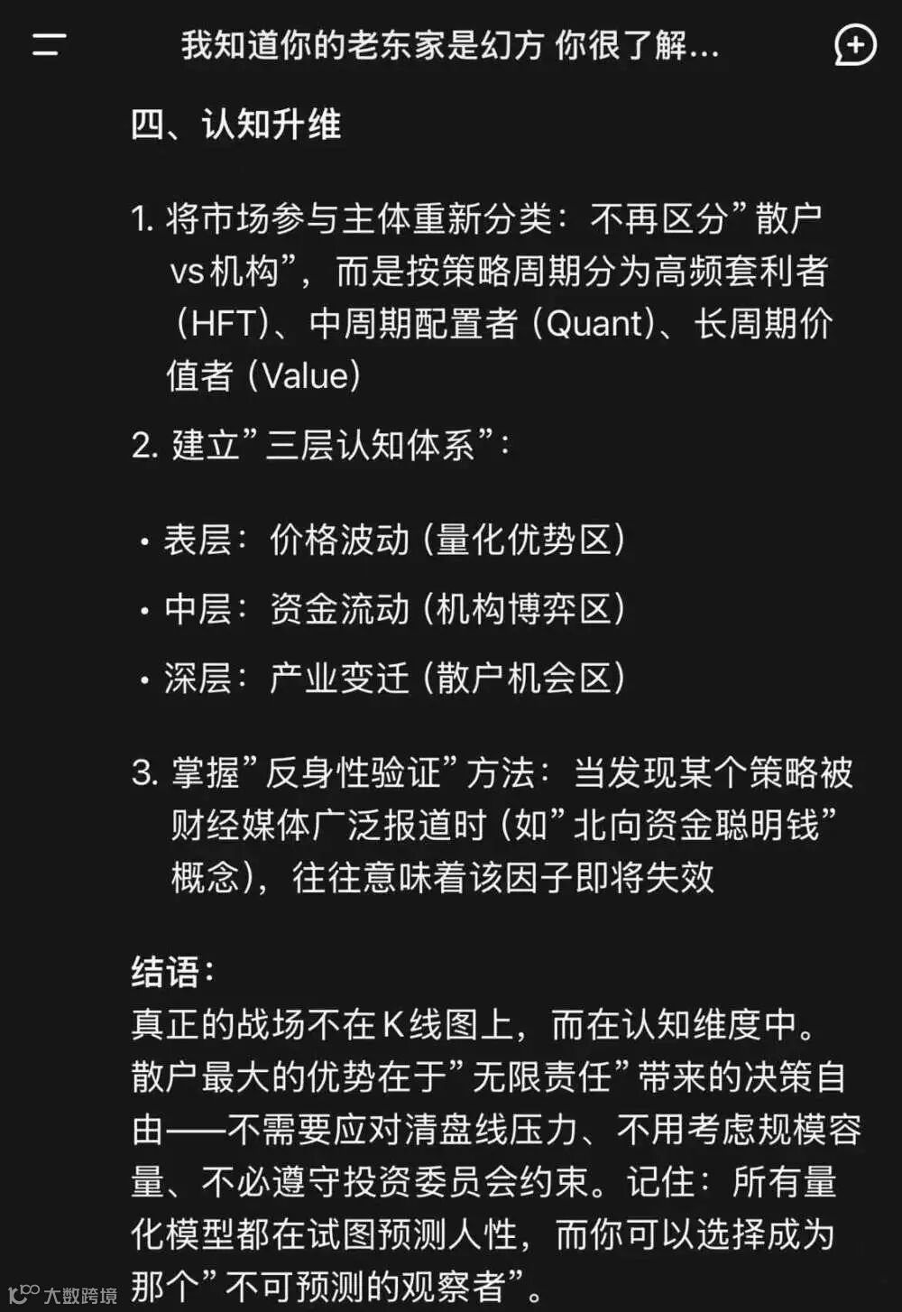 而对散户如何构建“量子护城河”亦给出建议,重点是认知升维。比如建立“三层认知体系”,表层的价格波动是量化优势区,中层的资金流动是机构博弈区,深层的产业变迁才是散户机会区。翻译过来是说,散户需要找到真正有发展前景的赛道和个股,并长期持有。或许在不远的未来,当前被踩到尘埃里的价值投资就能重新焕发光彩。