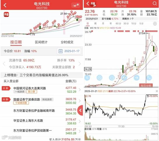 电光科技的情况也类似,1月17日龙虎榜显示陈小群买入4277万(卖出522万),宁波桑田路买入3609万(卖出3000万),量化净卖出;21日电光科技股价几乎全天水下,换手率达23.67%,直到尾盘才勉强回封,陈小群还在格局。