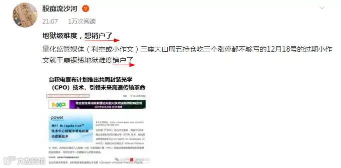虽然这波惨案直接原因可能是“题材股23日退潮的情绪崩溃”,以及股价已经涨太多,大量获利盘选择兑现;但也有市场人士猜测系“量化借陈小群人气,精准狙击游资与散户,暴力砸盘收割。”