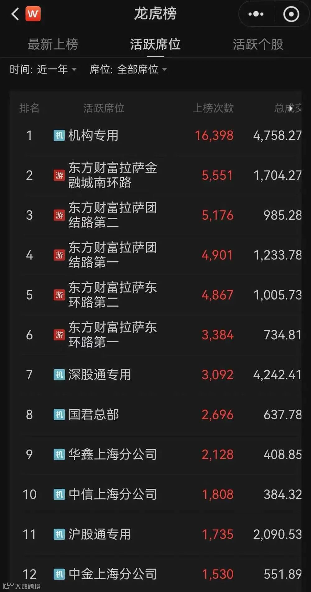 而在近一年中,国君总部、中金上海分公司和华鑫上海分公司等三大量化龙虎榜总成交金额分别高达637.78亿、551.89亿和408.85亿,排名仅次于机构专用、深股通专用等特殊席位以及有“散户大本营”之称的部分东方财富拉萨席位。