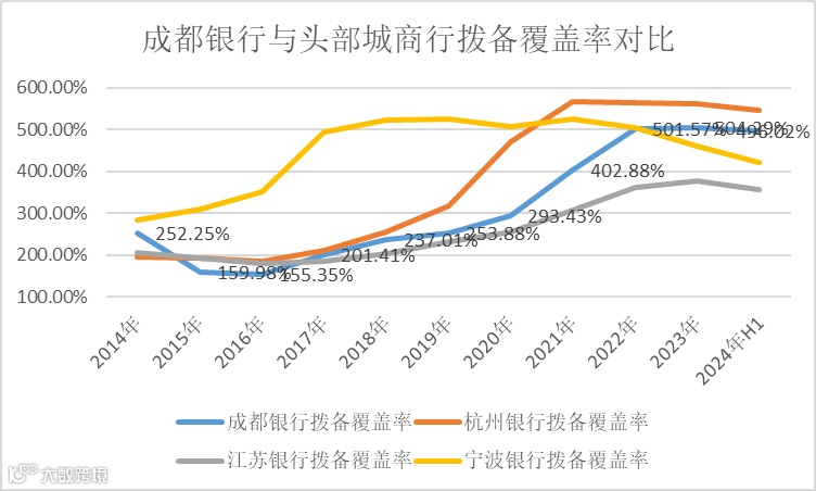 这种状况跟杭州银行比较类似。在优质城商行中,与成都银行可比性比较强的就是杭州银行,都是处在准一线城市,信贷以对公为主,投向基建类项目的比例都很高,非常受益于本地基建的扩张。与江苏、宁波、长沙等资产结构比较丰富的银行相比,贷款收益略低,不过胜在资产质量稳定,因为不良率目前都控制较好,高企的拨备覆盖率为利润释放提供了充足空间。