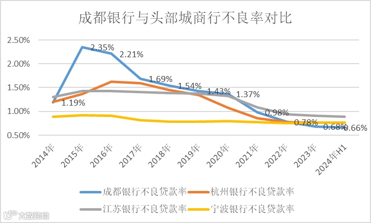 与此同时,虽然以涉政类对公贷款为主,与杭州银行比较类似,不过成都银行的贷款平均收益较高,同时对公优势获得了较多的本地政务类存款,导致净息差也一直保持相对不错的水平,虽然与江苏银行、宁波银行这类信贷结构更加丰富的银行相比有不足,不过要好于杭州银行。