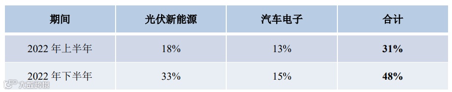 一方面,从下游应用领域来看,根据2022年显示,在2022年下半年光伏新能源和汽车电子成为公司产品重要的应用下游,合计占营收的比例达到48%,可以说光伏行业和汽车电子行业的景气度对于公司的业绩息息相关。