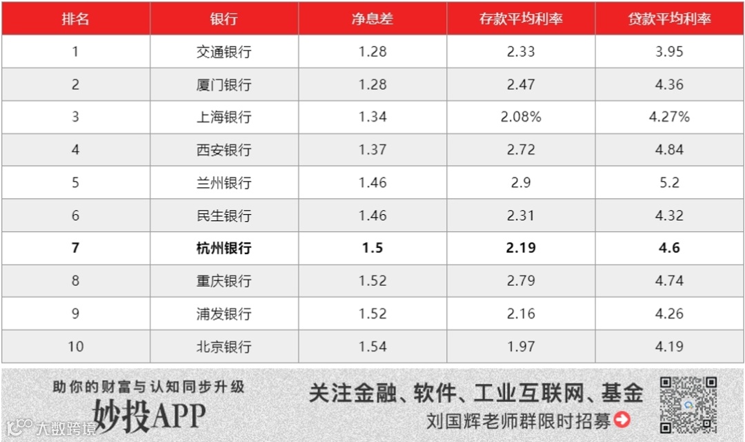 其次,净息差持续维持低位,使得杭州银行资产扩张虽然还可以,但带来的营收却打折扣。杭州银行的净息差在上市银行中已经较低,与很多业绩不佳的银行并列。
