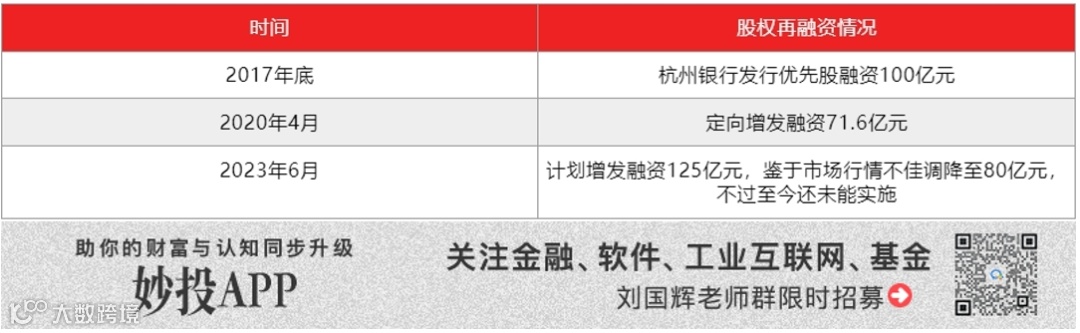 因此,杭州银行对资本补充的渴求一直很强烈,隔几年就需要股权再融资。如果再融资不通畅,杭州银行将不得不放缓资产扩张步伐。