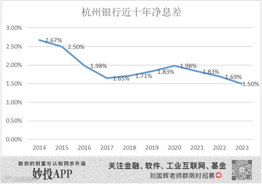 虽然近年来杭州银行在拓展个贷、科创贷款、制造业贷款等资产领域,但占比并不高,还是涉政基建类项目主导,一些科创领域的贷款如信息传输、软件和信息技术服务业贷款在2023年还出现下滑。杭州银行一直在着力发展零售业务,不过个贷在贷款中的比重只有34%,远不及对公贷款规模。因此贷款收益率没有明显上升,在基准利率依然有下调可能的情况下,净息差下滑压力依然较大,对营收增长有较大影响。
