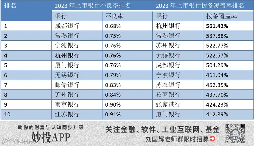 上市银行2023年不良率与净息差排名