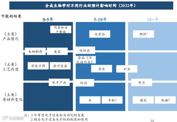 展望未来,短期看(0-10年),随着合成生物学的应用推广加快,医疗、化工、食品等行业均有望受到合成生物学技术进步带来的影响加速拓展。