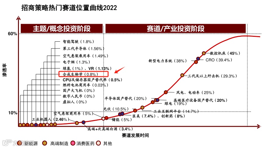 参考投资圈常用的产业生命周期模型,包括导入期(渗透率10%以下)、成长期(10%-30%/40%)、成熟期和衰退期。其中,行业在导入期和成长期阶段的增长速度是最快的,是企业成长的“甜蜜期”。则,投资选择这个时期入局,往往能够获得更高的投资胜率。