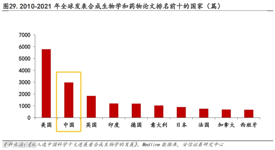 同时,技术支持下,国内在合成生物应用领域的基础研究靠前。根据《从入选中国科学十大进展看合成生物学的发展》,从2010年到2021年10月末全球范围内同时与“synthetic biology”和“drug”相关的文献共发表17718篇,数量上中国位居全球第二。