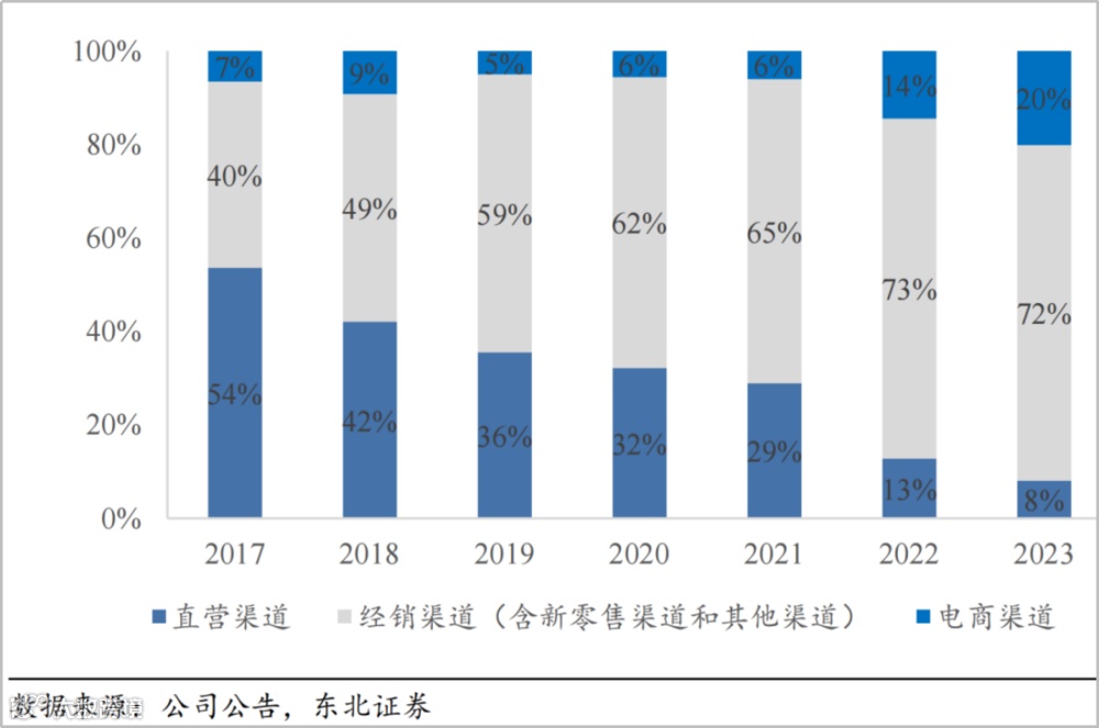2017年至2023年,盐津铺子直营渠道收入占比从53.6%降至8.1%,经销渠道收入占比从40%提升至72%,电商渠道收入占比从7%提升至20%。