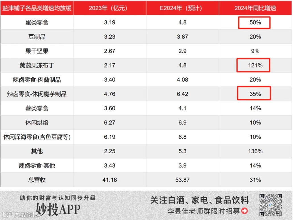 不过,“大魔王”素毛肚于2022年爆发,2023年表现不及预期,今年在低基数下销量略有回升,已近3年产品红利期末尾。“蛋皇”鹌鹑蛋2023年爆发,预计今年还将有1年放量红利期。但2024年之后,随着这些新品类的快速放量期接近尾声,盐津铺子未来的增长动力将面临考验。
