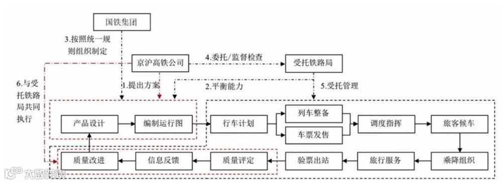 下图中,红色虚线框中为京沪高铁参与的主要环节,其他由受托铁路局承担,京沪高铁负责监督检查。