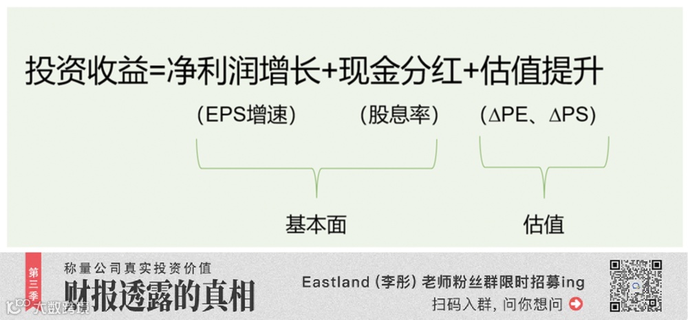 投资收益有两个来源:一是基本面(包括每股净利润和现金分红);二是估值(PE、PS)。