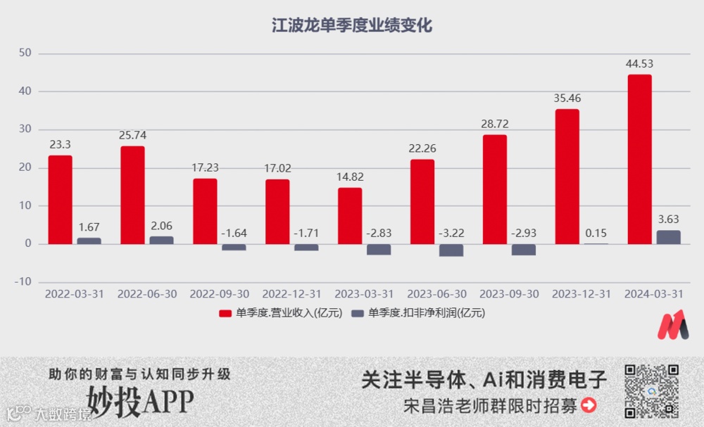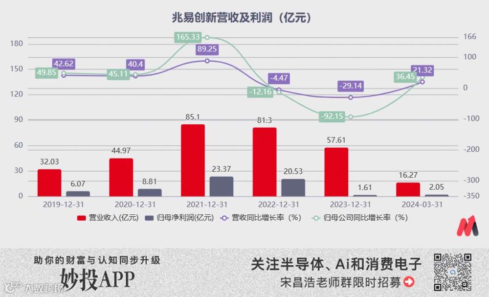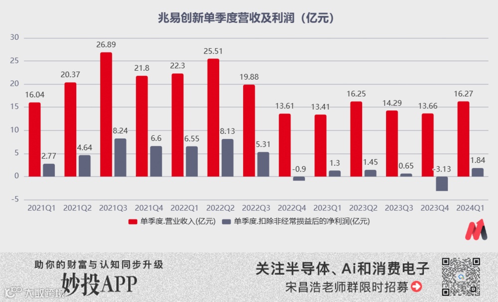 不过兆易创新的业绩和存储行业整体的复苏相比,仍有不小的差距。以同样在周末发布业绩,行业内关注度较高的江波龙作为对比,其2024年Q1公司的单季度营收44亿,扣非3.63亿,创下了历史新高。