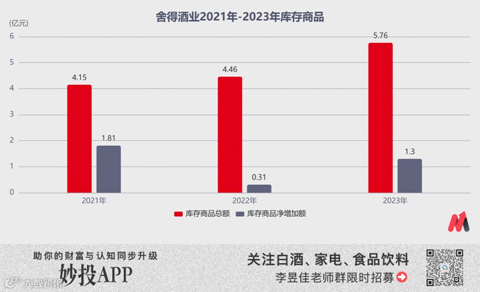 去年底,舍得酒业存货中的库存商品有5.76亿元,同比净增加了1.3亿元,大幅高于2022年的净增加值,产品似乎很难卖。