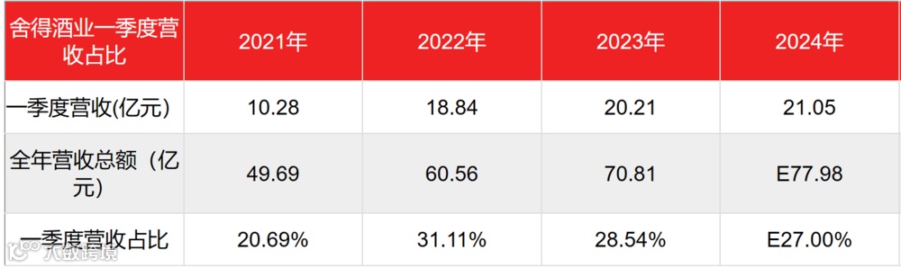 通常来讲,一季度开门红对酒企全年营收至关重要。2021年至2023年,舍得酒业基本面在复星集团赋能之下逐渐稳价,一季度营收占全年营收的比例在30%上下浮动。
