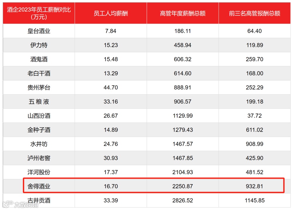 2023年,舍得酒业员工人均薪酬16.7万元,仅处于业内中等水平。而932.81万元的前三名高管薪酬则仅次于古井贡酒,位列业内第二,是茅台高管薪酬的3.7倍,是五粮液的4.7倍。