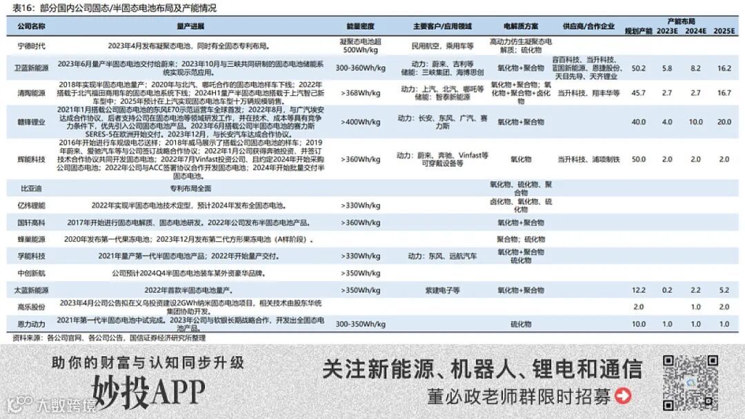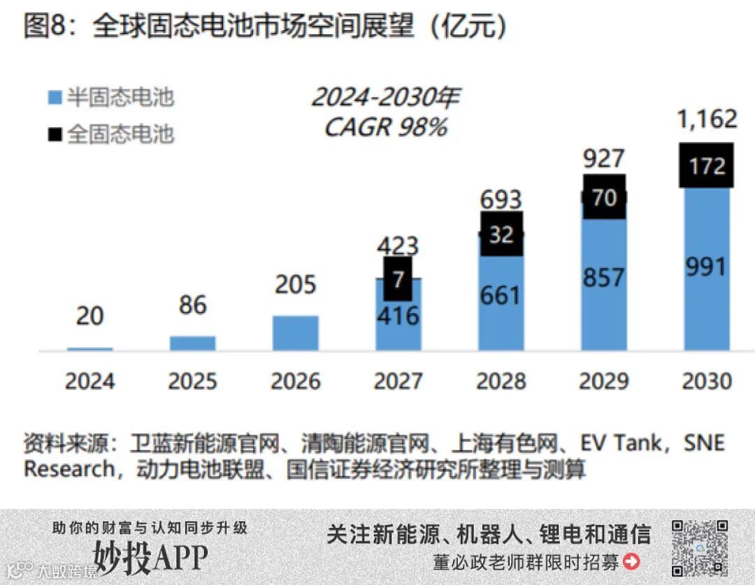 妙投认为,受益于半固态电池及固态电池的发展浪潮、电池企业及其供应链受益的确定性更高。