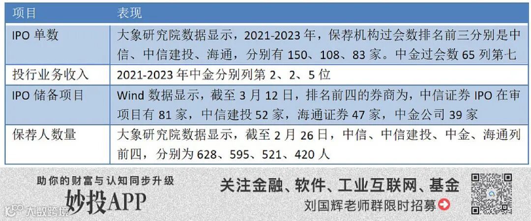综合几个指标来看,中金投行在业内是绝对的头部,多年以来业绩激励一直是业界最高,吸引人才打造团队,在项目发掘、定价、合规等方面形成专业能力,大项目上依然能获取,在科创板上市项目承销保荐上也有较好表现。