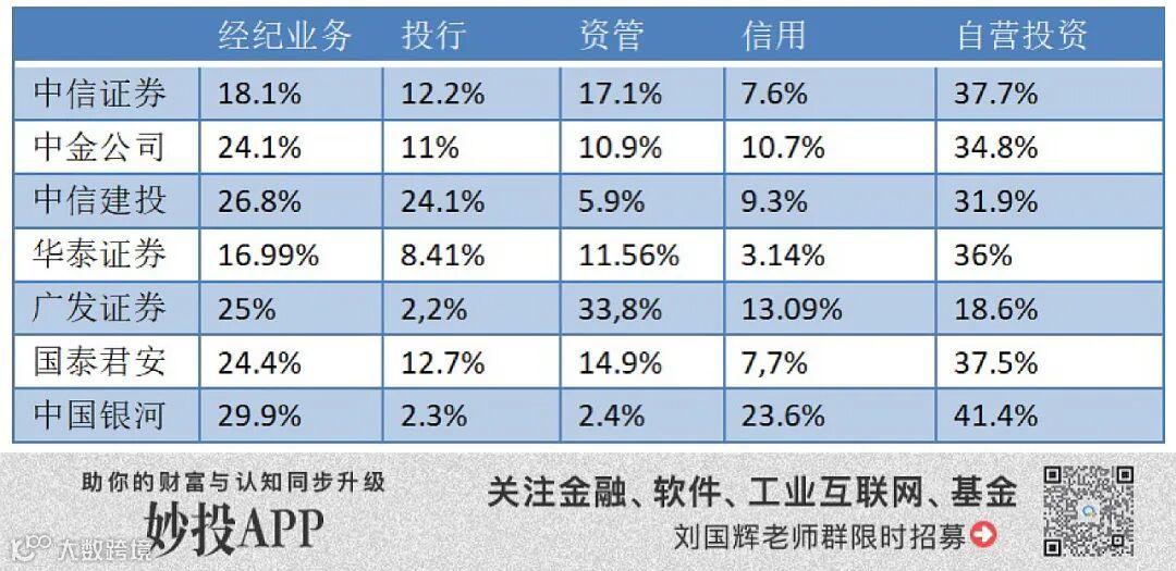 全行业来看,自营业务占比最大,超过三成;经纪业务超过两成。投行业务占到10%-15%,信用业务占比在10%以上,资管业务占比也在10%左右。