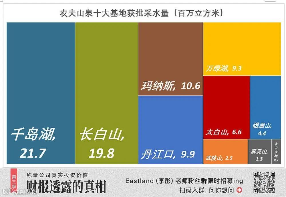 下图是十个水源基地获批的年提取额度,其中浙江千岛湖每年可取湖水2166万立方米,长白山的五处水源每年可采矿泉水1982万立方米。