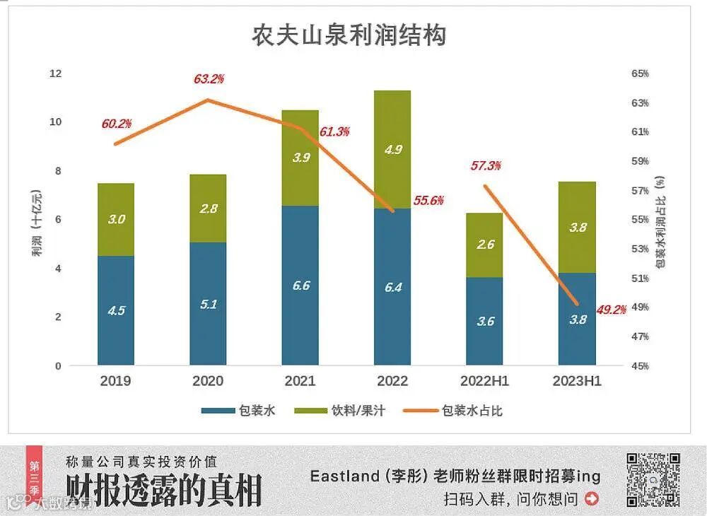 包装饮用水业务利润率高,有缓慢回落迹象:2020年分部利润51亿,利润率36.2%;2021年利润65.8亿,利润率38.5%;2022年利润回落至64.4亿,利润率35.3%;2023年H1,利润38亿,利润率36.4%。