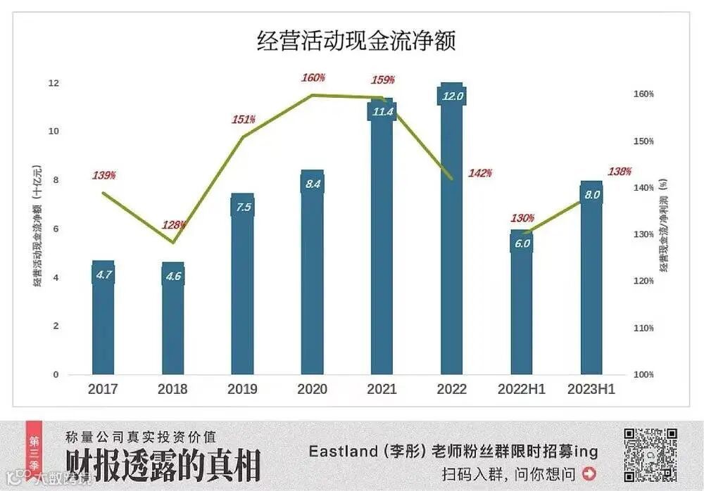 2023年H1,经营活动现金流80亿,为净利润的138%。