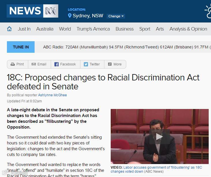 日前,自由党提出要修改《反种族歧视法》18C条款,即基于种族、肤色、民族来源等背景“冒犯、侮辱和羞辱”个人或一群人即属违法。