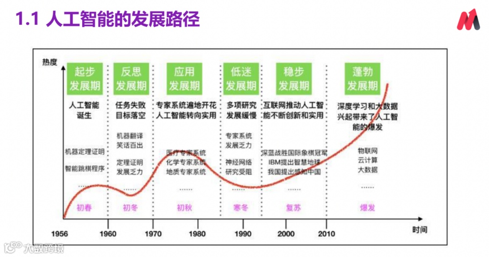 所以人工智能其实是一个比较古老的概念,但它整个发展周期其实非常漫长。如果对人工智能感兴趣,推荐大家看一本书叫《人工智能简史》,可以更清晰看到人工智能的发展过程。