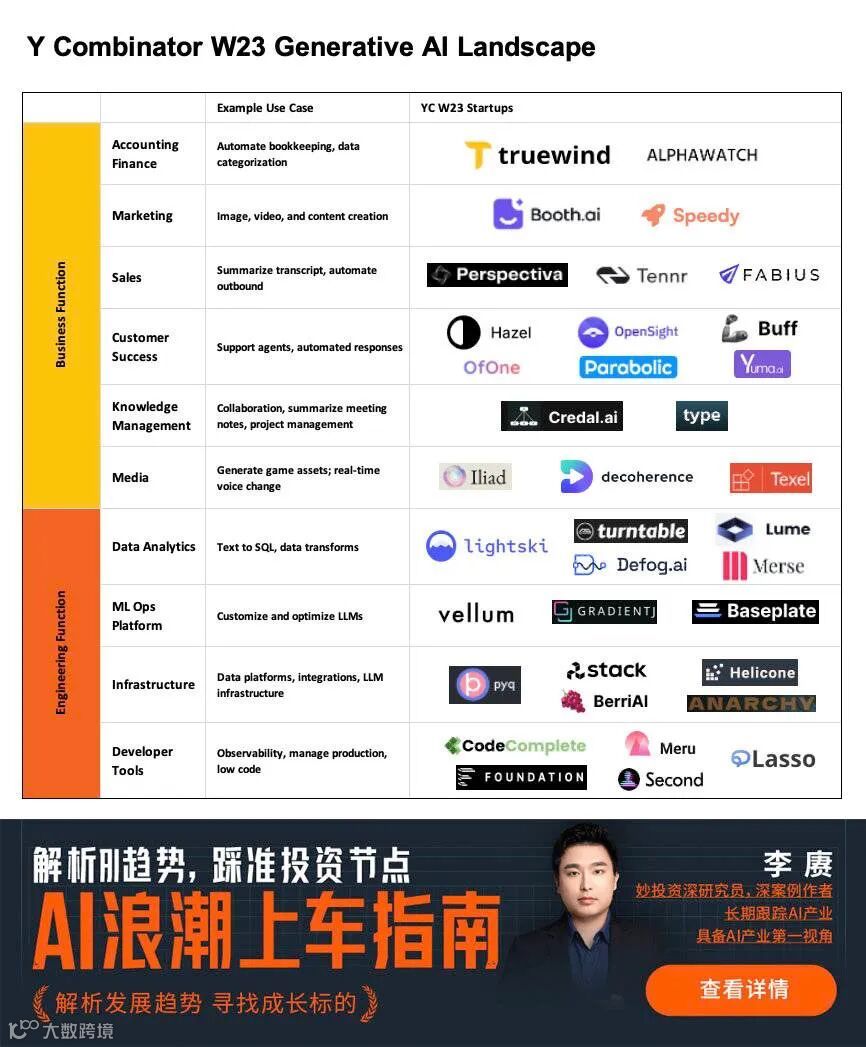 在应用领域也是如此,目前国内的大模型应用仍集中在搜索、对话、文字处理等领域。国外已经先期掀起了AI创业公司的浪潮,其中硅谷顶级孵化器Y Combinator 2023冬季孵化营中出现了上百家涉及全新AI技术的创业公司,占到了今年总孵化项目数量的近40%。