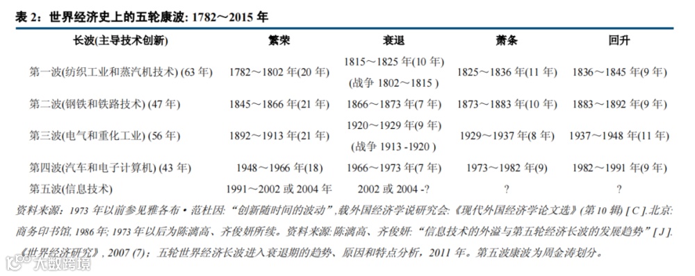 但目前是衰退周期还是复苏周期?这个边界较难判断,因为它们的界线是技术创新活动的底部拐点,而且是一次为期50年(可能越来越短)的颠覆性的新技术的起点。