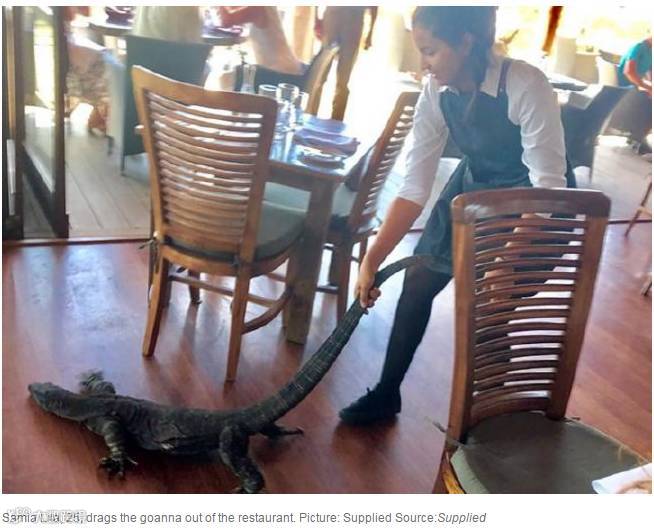 这位女服务生今年25岁,名叫Samia Lila来自法国,持澳洲打工度假签证(462visa)在这家餐厅工作。当她拽住这只巨蜥硕大的尾巴,并把它拖出了餐厅的时候,周围用餐的客人们都惊呆了!!