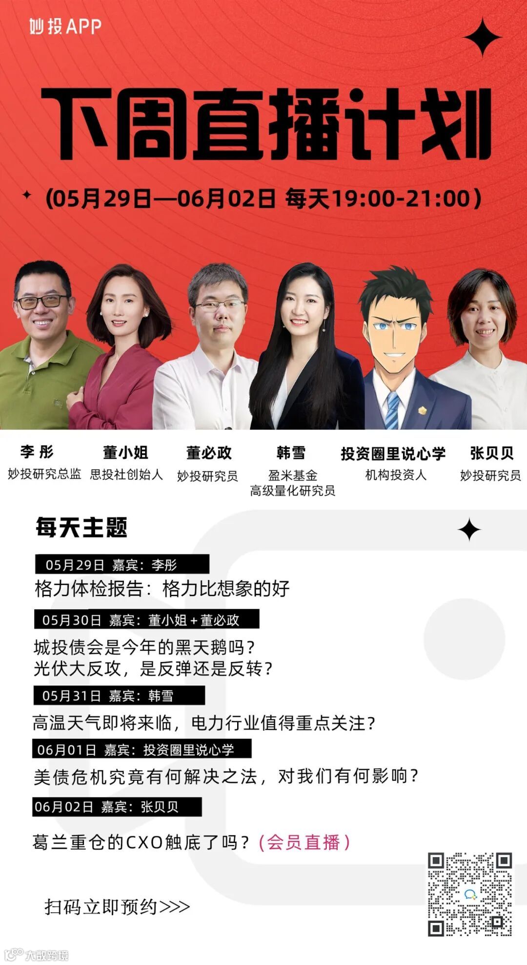 同时下周二,妙投研究员董必政老师还会在直播间和大家聊聊最近的光伏,最近光伏上涨的原因是什么?是不是可持续?等等。