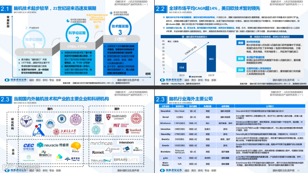 国信证券指出,当前脑机接口相关技术尚处于早期,但是从应用领域和未来商业价值上均具备较大潜力,建议重点关注两条主线: