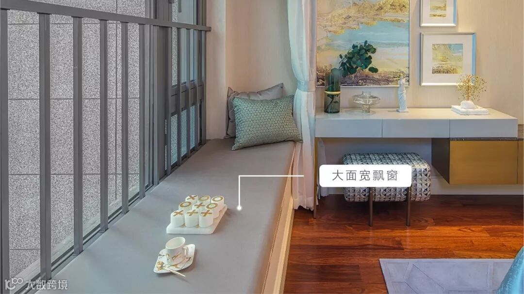 约60厘米飘窗,整体拉伸空间,约45cm人体工程学飘窗符合人体工学设计,满足人们正常习惯高度。