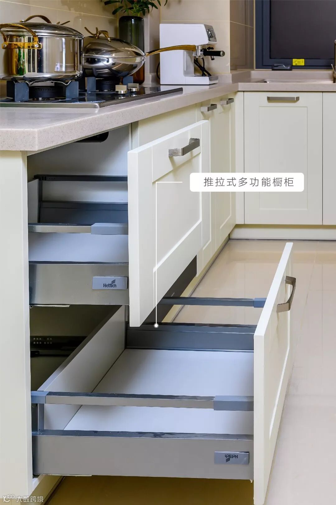 推拉式碗橱,收纳碗、碟精巧方便,边缘高度差、金属栏杆处理,防止碗碟碎落。