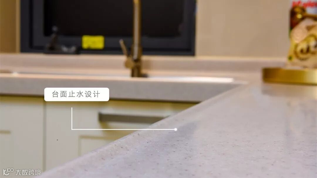 厨房台面边缘上翻设计,防止余水滴落,打理更简易,保持地面干燥清洁。
