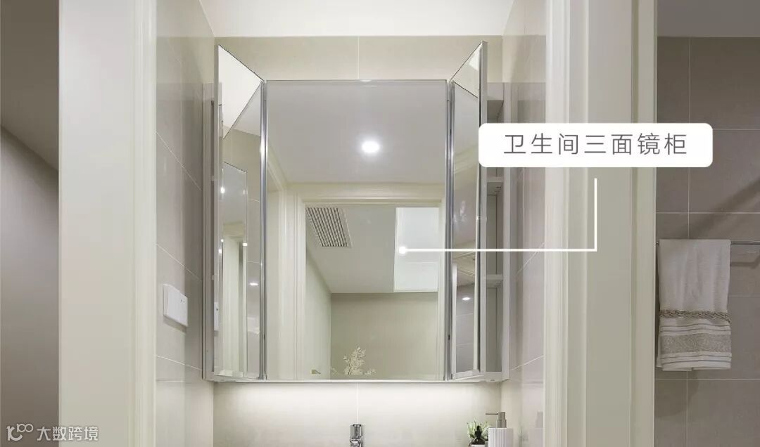 化妆镜采用电加热防雾功能(中间区域),背面设置化妆品镜柜,可放置业主的洗漱用品及化妆品等,三门镜柜270°独特的镜柜开启方式可使业主在梳洗的时候看到侧面妆容是否整齐。
