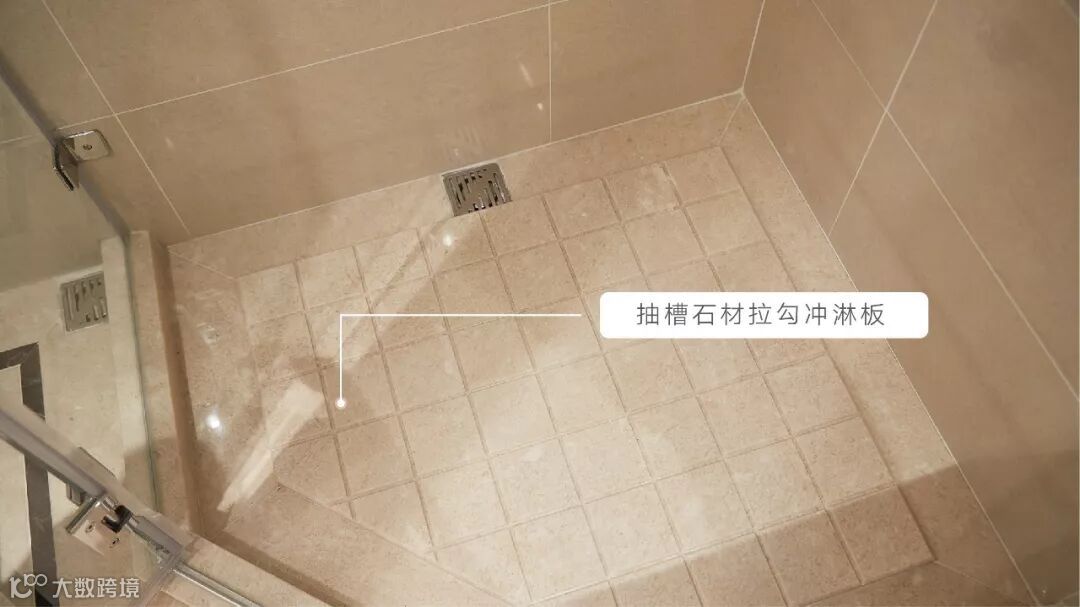 淋浴房地面采用抽槽石材拉勾冲淋板设计,减少淋浴时因为有水而不慎滑倒的风险,保障居者安全。