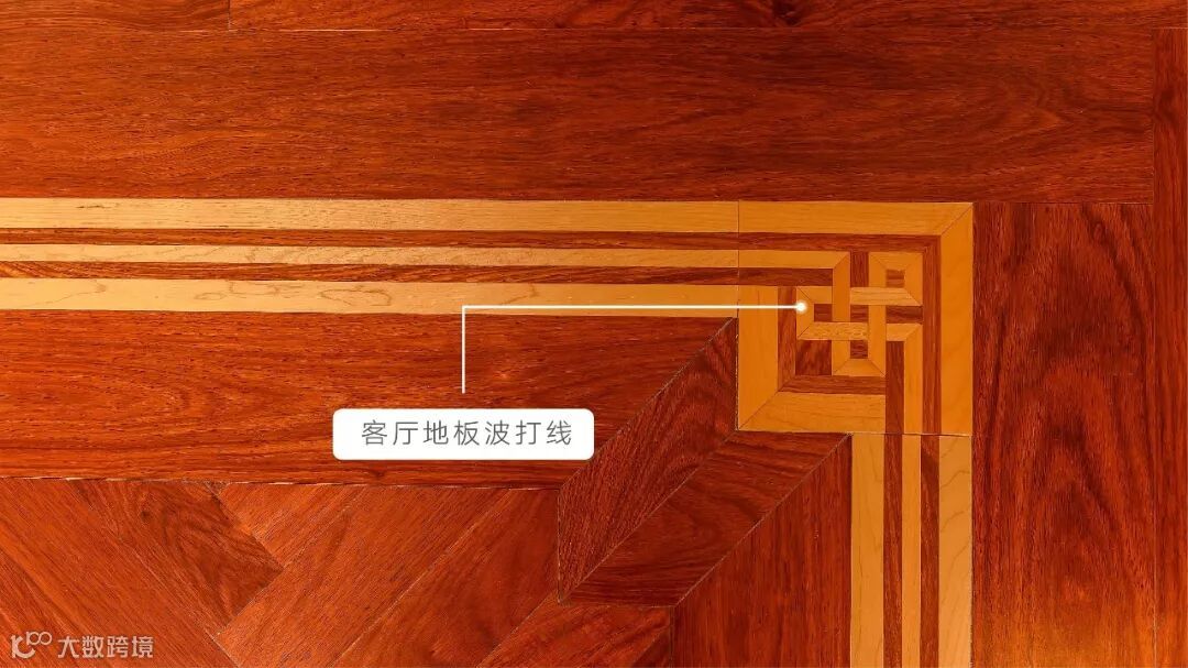 木地板拼花波打线的工艺较为复杂,亚花梨地板上铣槽嵌入枫木线条交错排列成型的图案极具内涵,增强归家入户的仪式感。