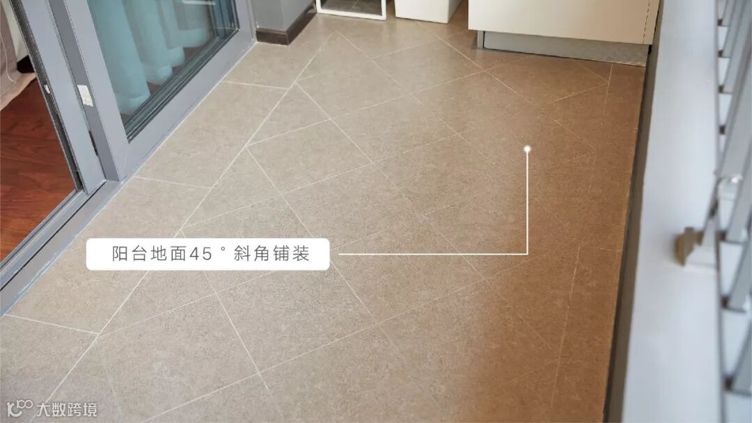 阳台地面以45°斜角铺装,防止雨天或晾晒落水向屋内流渗。