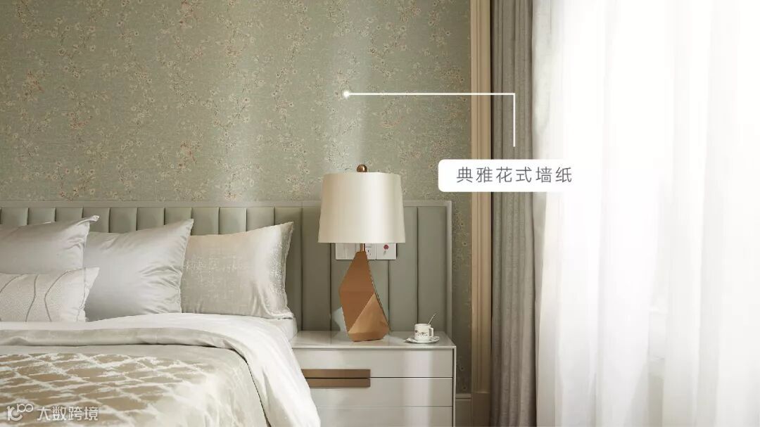 床头背景以典雅花纹墙纸铺装+木饰线条装饰组成,温馨浪漫。