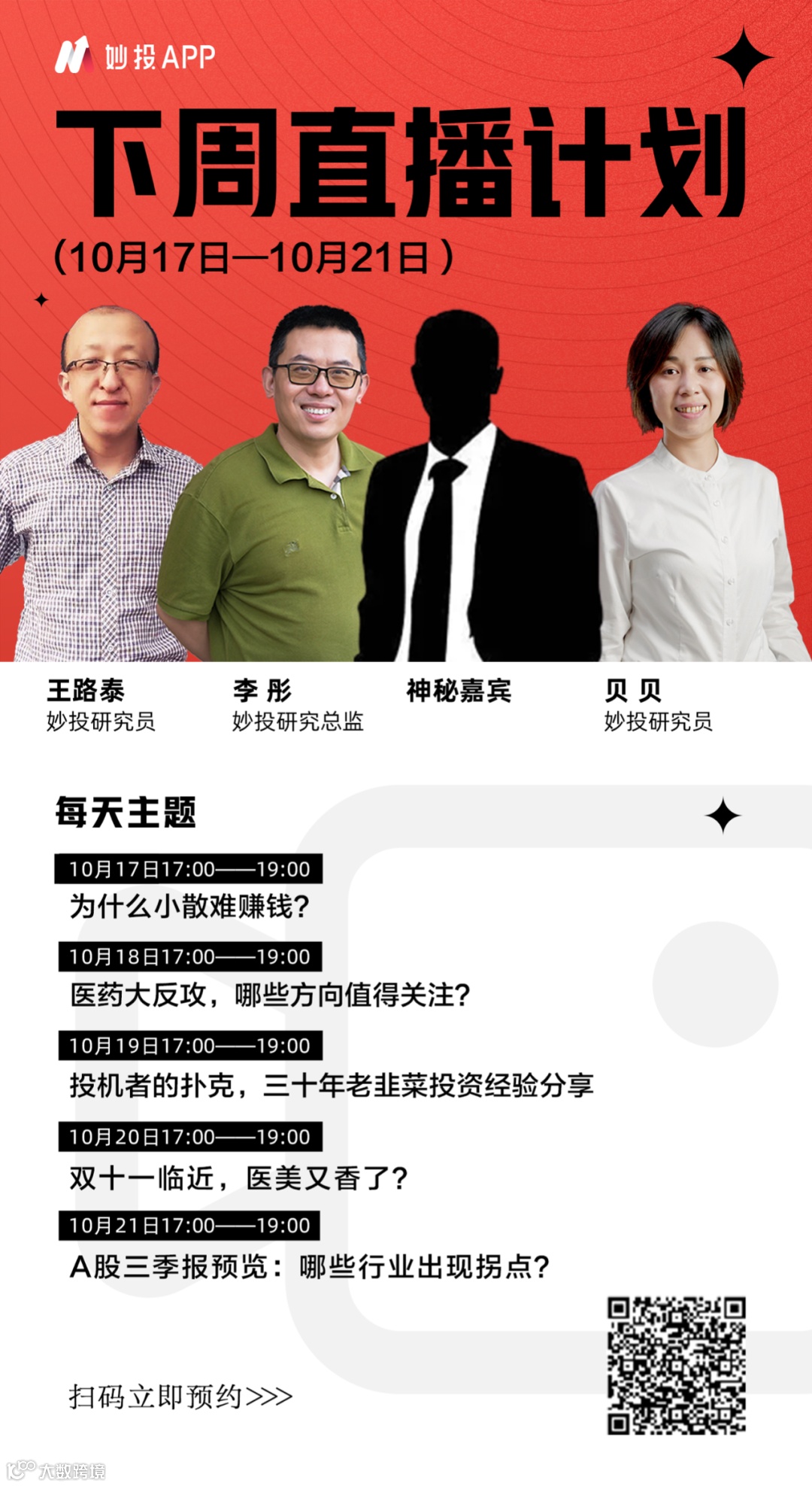 每个交易日下午5点—7点,《妙投直播栏目》下周将邀请行业专家,与大家直播畅聊市场热点,以及宏观、行业和公司。