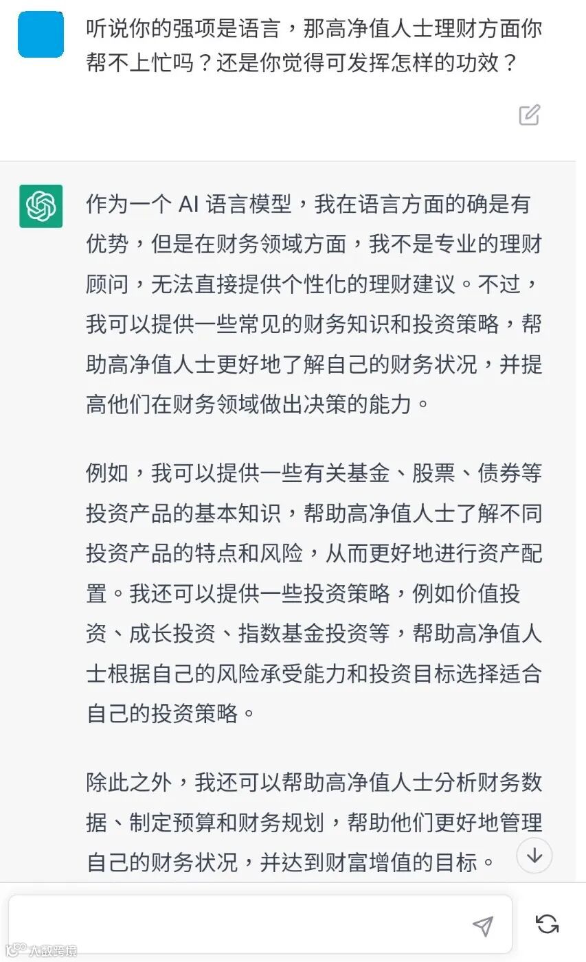 ChatGPT火爆出圈,引起金融业的广泛关注。到底ChatGPT会否让金融服务业部分岗位消失,尤其在帮助高净值人士进行资产增值和传承策划这块上,会否取代专业人士和机构的工作?以下为大家提供分析和实测,以供参考。