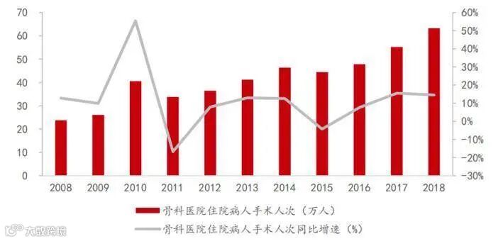 从骨科医院住院病人手术人次看,近年来的复合增速保持在10%以上,这与目前中国老龄化的现状相吻合。